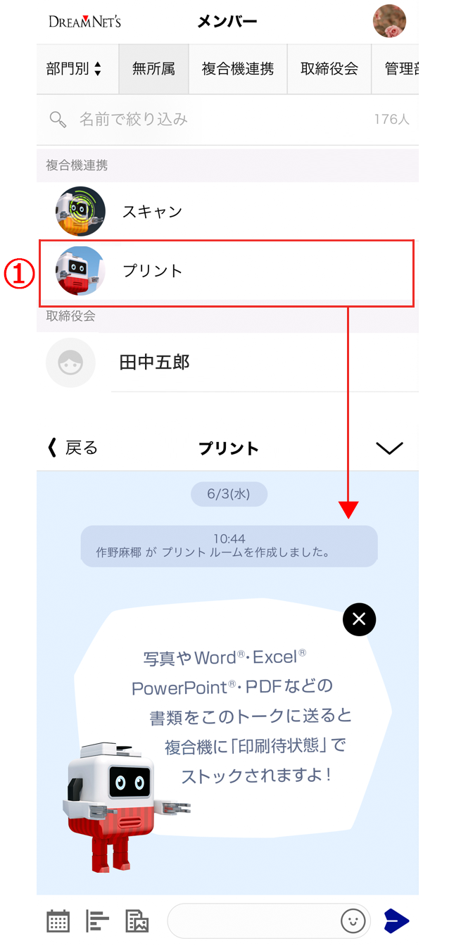 ①メンバー一覧からプリンター専用トークルーム「プリント」をトークへ追加します。